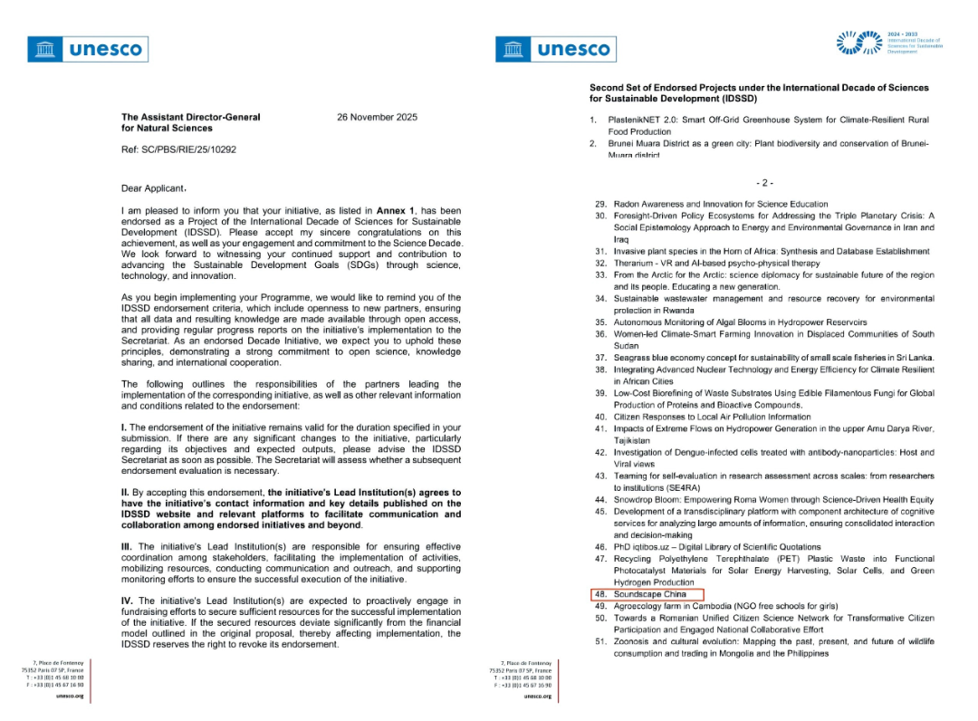 近日,由中国科学院动物研究所牵头发起的 “声景中国(Soundscape China)”项目 成功入选联合国《2024—2033科学促进可持续发展国际十年》计划(IDSSD),标志着我国在自然声景监测与生物多样性智慧保护领域迈入国际前沿。
